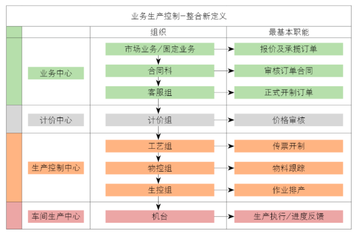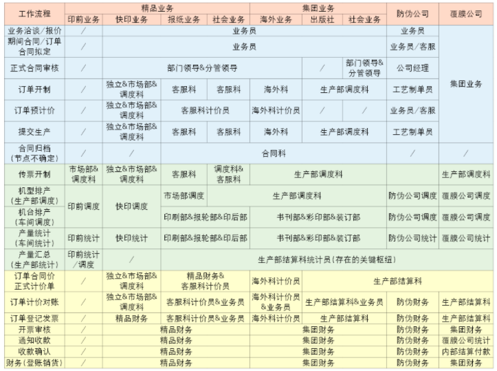 從ERP生產(chǎn)流程上看(圖1最左邊的列),在系統(tǒng)中單據(jù)穿插的部門非常多,例如,精品業(yè)務(wù)下的社會業(yè)務(wù)中,訂單開制是精品部門,而到了傳票開制和機型排產(chǎn)又是集團部門,到了機臺排產(chǎn)又變成了精品部門?梢韵胂螅绻硞訂單需要改機型、更換車間,或臨時發(fā)外加工等特殊情況,根本就無法高效地安排生產(chǎn),無法加強各個生產(chǎn)車間內(nèi)部的管理,實際生產(chǎn)中我公司這種情況還不少。