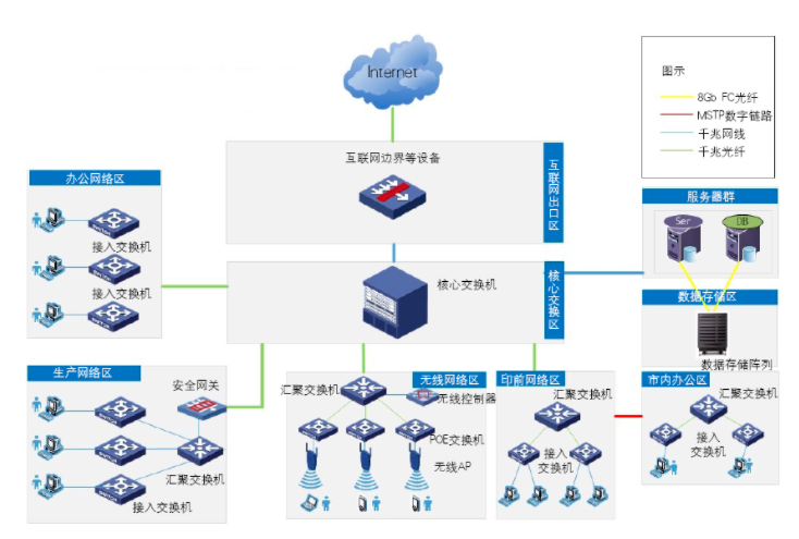 必須根據(jù)企業(yè)的自身規(guī)模,搭配合理、經(jīng)濟、高效、可靠的網(wǎng)絡(luò)環(huán)境,確保ERP系統(tǒng)運行順暢。圖2是我公司簡化的網(wǎng)絡(luò)拓撲圖,首先按需求將內(nèi)網(wǎng)分為生產(chǎn)網(wǎng)絡(luò)區(qū)、辦公網(wǎng)絡(luò)區(qū)、生產(chǎn)無線網(wǎng)絡(luò)區(qū)、印前網(wǎng)絡(luò)區(qū)等,核心交換設(shè)備上設(shè)置相關(guān)策略、規(guī)則進行管控。外網(wǎng)出口至互聯(lián)網(wǎng)有2條出口線路,一條為電信100M光纖,一條為公司內(nèi)專線。除此之外與公司設(shè)在市內(nèi)的辦公區(qū)之間通過數(shù)字鏈路進行互連(外連辦公網(wǎng)絡(luò)區(qū))。
